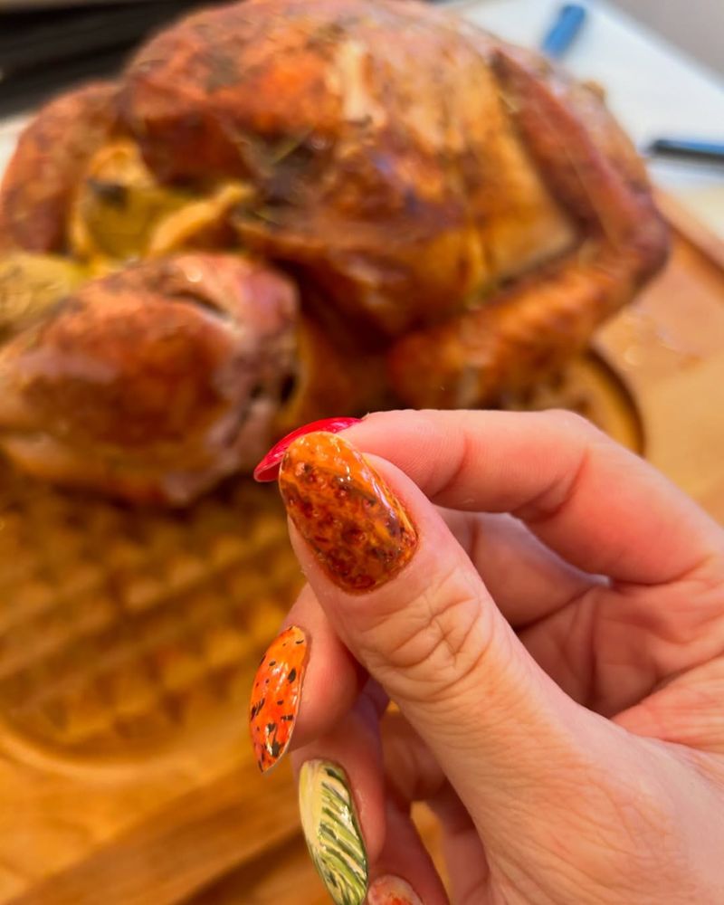 Crusty turkey nail art captures the cozy spirit of Thanksgiving with warm brown tones, roasted textures, and playful turkey-inspired details. These nails feel festive yet stylish, blending food-themed creativity with autumn colors that perfectly match holiday gatherings and fall fashion.