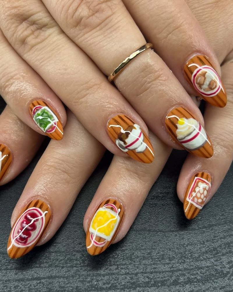 Yummy nails are inspired by Thanksgiving comfort foods, featuring warm colors and playful designs that feel fun and indulgent. Think creamy tones, glossy finishes, and food-themed accents that add charm while keeping the manicure stylish and seasonally appropriate.